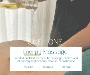 Qualified massage blended with a mix of energy healing, clearing and balancing whilst activating your potential. Best of two worlds brought together.